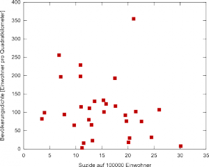 | Land | Suzide auf 100000 Einwohner | Bevölkerungsdichte [EW/km²] |